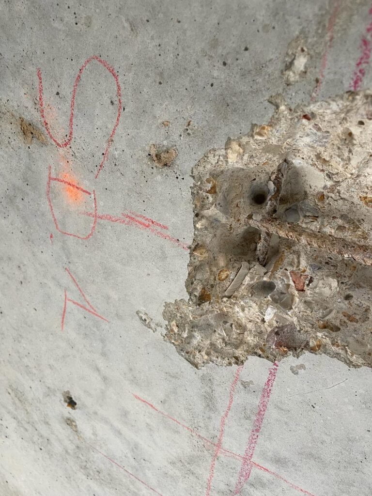 - Phase 2 : Les Sondages pour une Validation Physique (Destructive) Les données radar, aussi précises soient-elles, nécessitaient une confirmation physique pour être complètes. Des sondages destructifs (piquages) ont été réalisés à des endroits stratégiques. Ces ouvertures ciblées nous ont permis d’exposer les armatures pour en mesurer le diamètre réel (Ø7mm, Ø9mm, etc.) et de valider les profondeurs d’enrobage. En parallèle, des carottages ont été effectués pour prélever des cylindres de béton. Ces échantillons, remis au client, étaient destinés à des essais de compression en laboratoire pour déterminer sans équivoque la résistance du matériau.