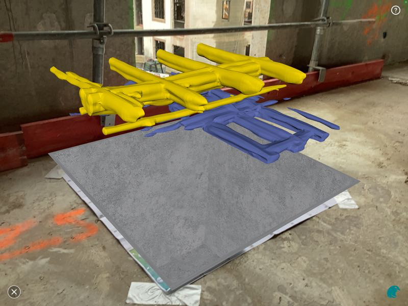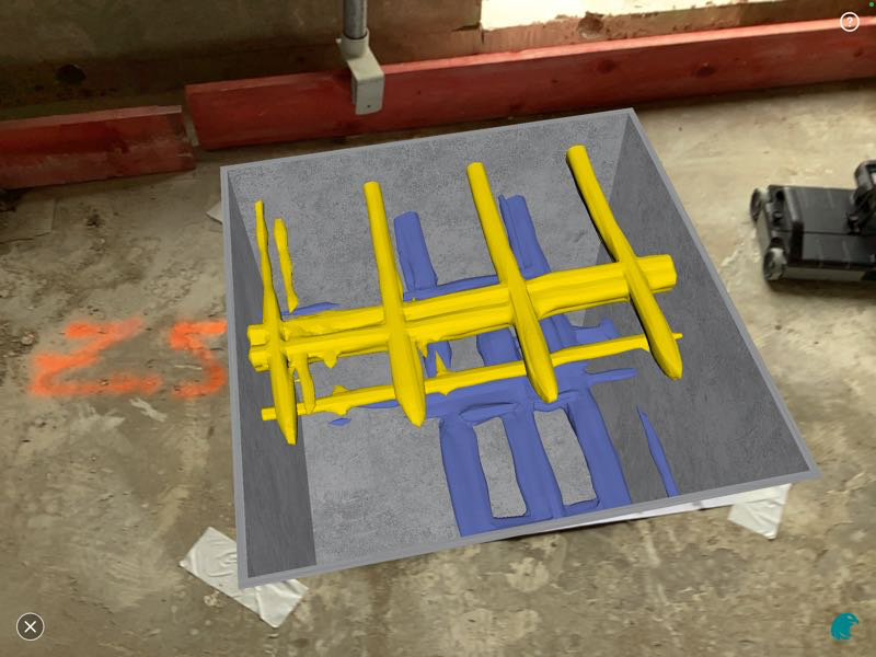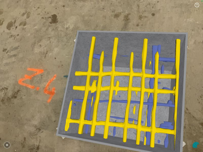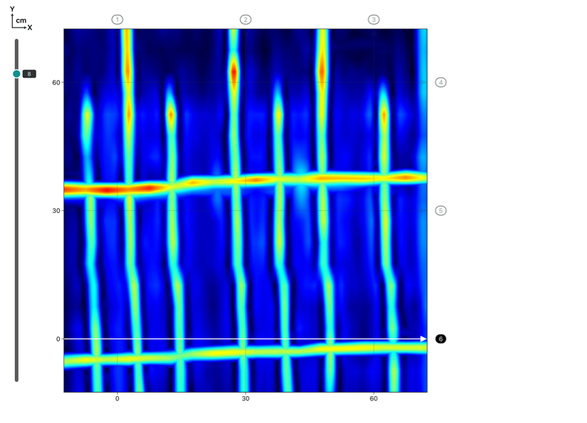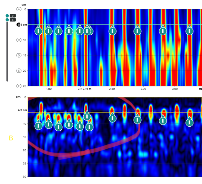 - Phase 1 : L’Auscultation Radar pour une Cartographie Globale (Non-Destructive) Dans un premier temps, l’ensemble des planchers à R+1 et R+2 a été systématiquement balayé à l’aide de notre radar de structure Proceq GP8100. Cette technologie nous a permis de générer une cartographie 3D précise du ferraillage sans aucun dommage à la structure. Nous avons ainsi pu visualiser le maillage des treillis soudés, identifier des paquets d’aciers spécifiques et mettre en évidence des zones complexes présentant un recouvrement de nappes.