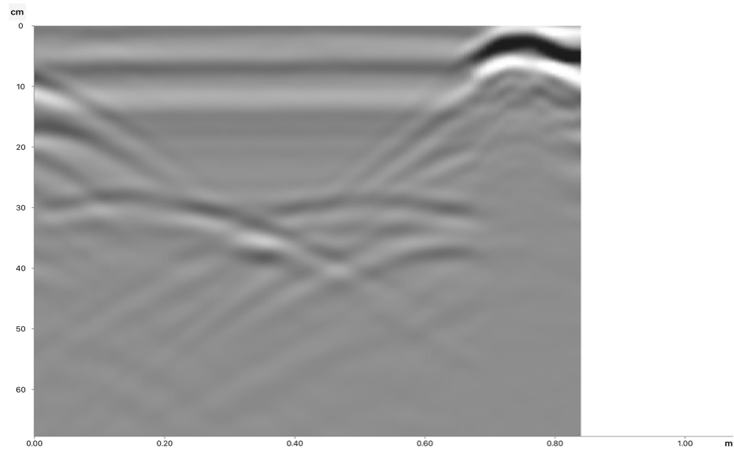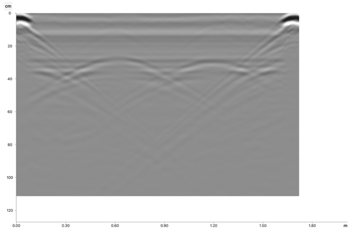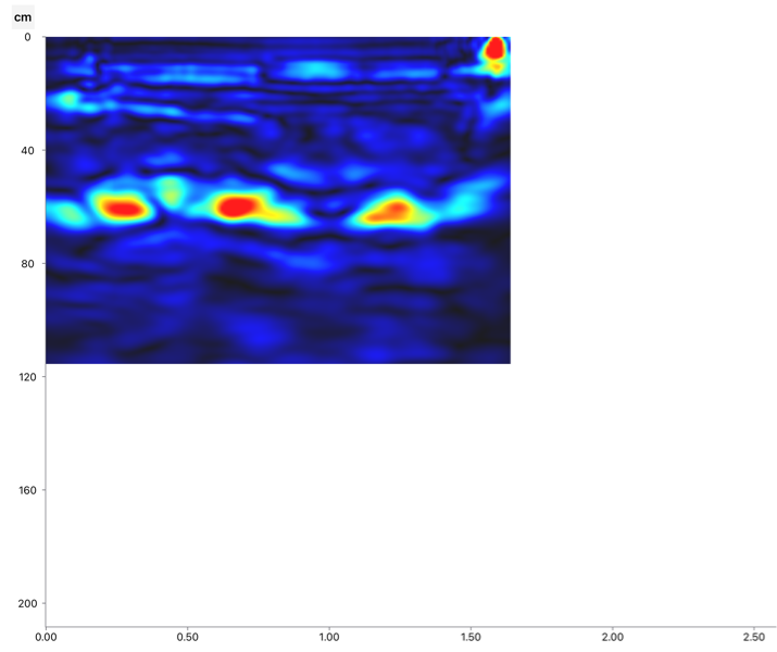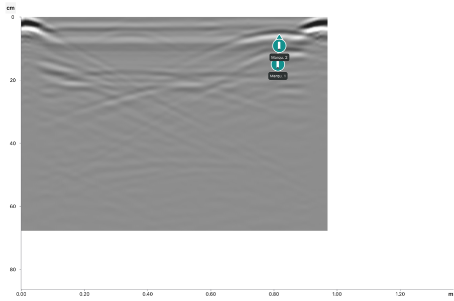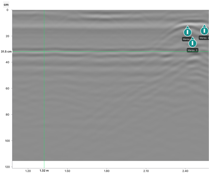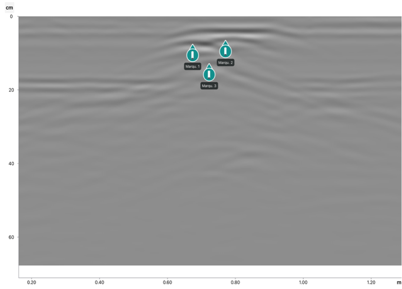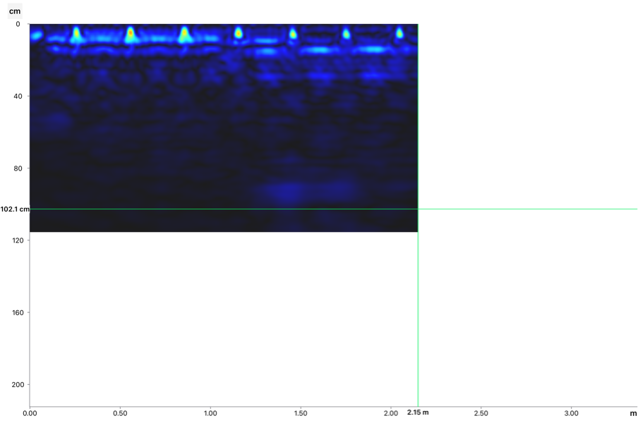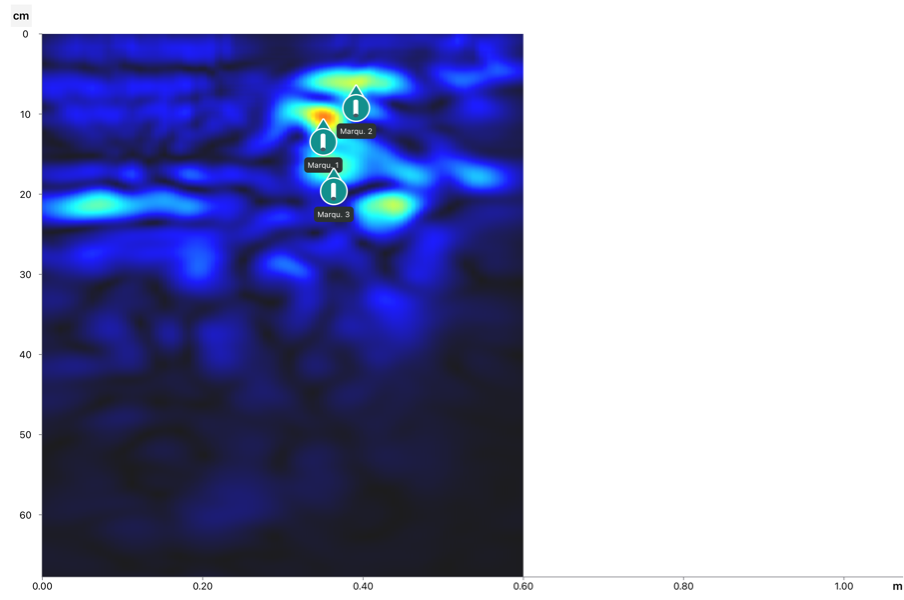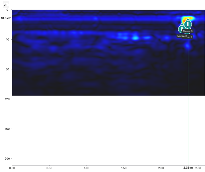 • Absence de chaînages verticaux : Plusieurs scans, notamment au niveau des jambages de la porte d’entrée (Zone 2) et sur un mur de plus de 5 mètres (Zone 1), ont confirmé l’absence totale des chaînages verticaux réglementaires.