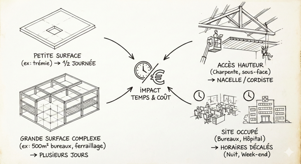 - L’accès : Si la structure est à 8 mètres de haut (charpente, sous-face de plancher industriel), la location d’une nacelle ou l’intervention de cordistes alourdit le devis.
