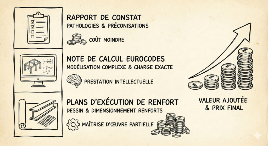 - Note de calcul Eurocodes : « Voici la charge exacte au m² que votre plancher peut supporter ». Cela implique une modélisation informatique complexe (rétro-ingénierie) par nos ingénieurs calcul. C’est une prestation intellectuelle à haute valeur ajoutée.