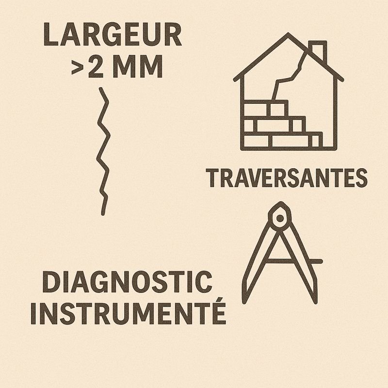 • Traversantes (visibles dedans et dehors), … signalent un mouvement de fondation ou une flexion de structure. Seul un diagnostic instrumenté (fissuromètres, étude de sol G5, analyse des descentes de charges) peut déterminer si la maison est en danger d’effondrement ou si le mouvement est stabilisé.