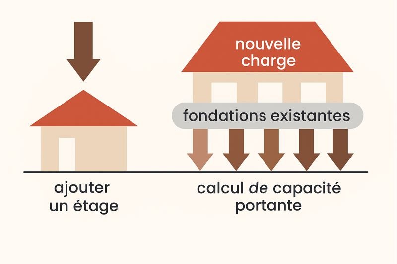Ajouter un étage, c’est ajouter des tonnes de charge sur des fondations existantes qui n’ont pas été prévues pour cela. Un calcul de capacité portante est obligatoire pour vérifier si les semelles de fondation et les murs du rez-de-chaussée peuvent encaisser ce surpoids sans se tasser.